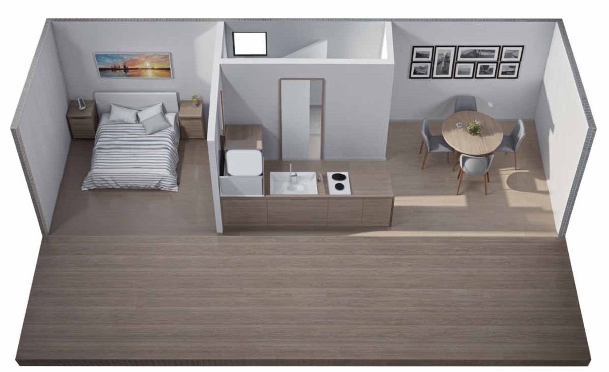 - The Emu comes standard with versatile living/bed studio and a generous bathroom zone.